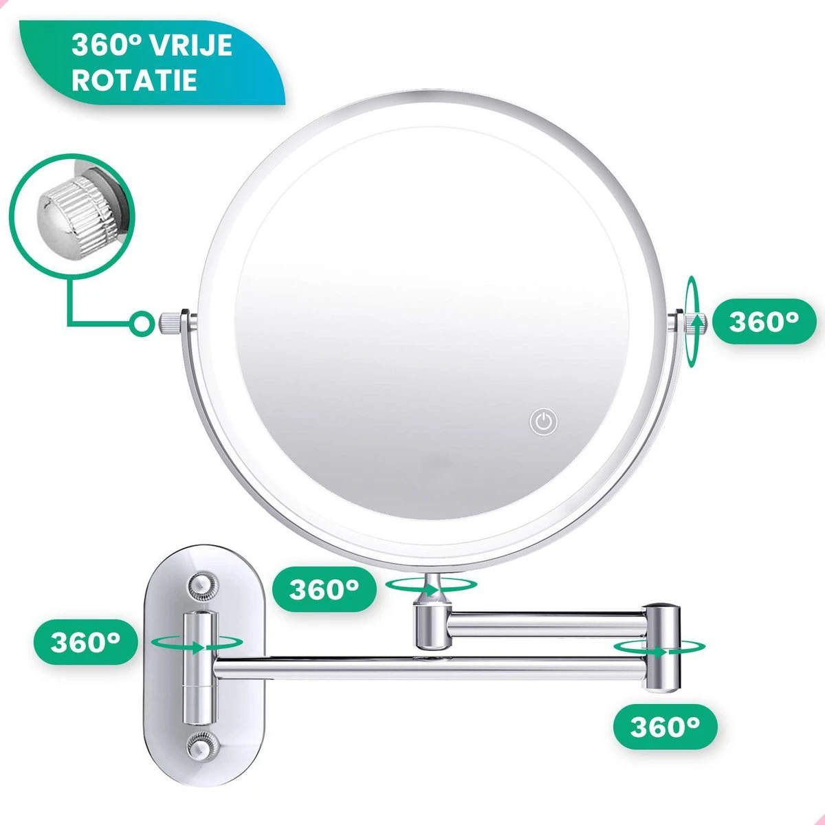 De spiegel is 360 graden horizontaal en verticaal roteerbaar. Zo kun je vanuit alle denkbare hoeken jezelf goed in de spiegel zien. Deze LED spiegel is perfect voor het opmaken, epileren, scheren en om lenzen aan te brengen, zelfs in donkere of slecht verlichte ruimtes.