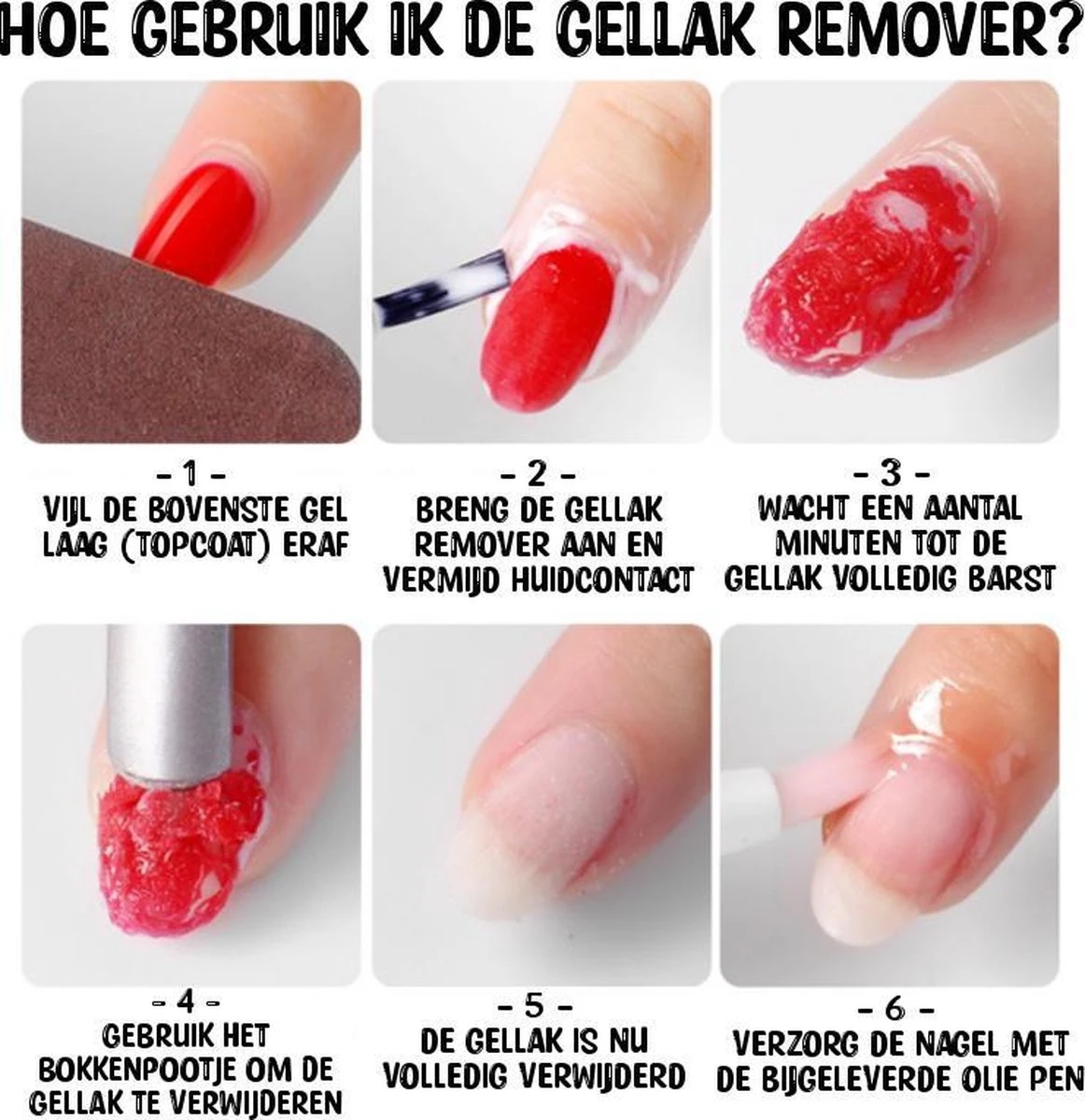 Het proces is gemakkelijk en snel! Vijl je nagels grondig om de bovenste laag nagellak, oftewel de top coat, te verwijderen. Breng hierna een laag Magische Gellak Remover aan op de gellak en laat het ongeveer 5 minuten intrekken. De gel begint te borrelen en af ​​te pellen, waardoor het moeiteloos afgeschraapt kan worden met het bijgeleverde stalen bokkenpootje. Was u handen altijd onmiddellijk na gebruik. Sluit het deksel na gebruik goed om te voorkomen dat de gelpasta opdroogt.